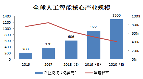 資料來源:中國(guó)電子學(xué)會,钜派研究院 3 逐年遞增的産業規模 2017年,全球人工智能(néng)核心産業超過(guò)了370億美元的規模,而中國(guó)人工智能(néng)核心産業規模占比超過(guò)了15%。 得益于移動互聯網、大數據、和雲計算的不斷發(fā)展,人工智能(néng)將(jiāng)會随着可收集數據質量和數量的不斷提升,加快其技術的革新和商業運營模式的發(fā)展。預計2020年,全球人工智能(néng)核心産業將(jiāng)達到1300億美元的規模。